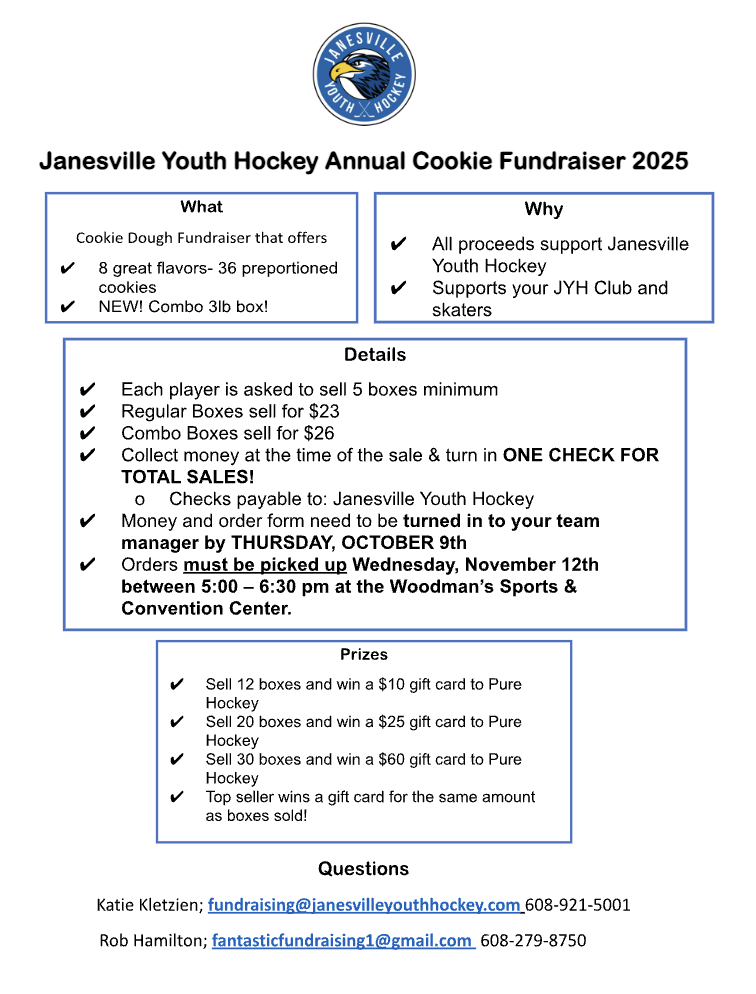 The Janesville Youth Hockey Club organizes various fundraising events throughout the season in order to provide support for our nonprofit organization's initiatives and programs.